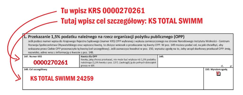 Jeśli wypełniasz formularz podatkowy PIT 37, w rubryce 147 wprowadź nr KRS 0000270261, a w rubryce 149 koniecznie wpisz cel szczegółowy: KS TOTAL SWIMM 24259. W pozycji 148 wprowadź wyliczoną kwotę 1,5 % swojego podatku (programy do rozliczenia PIT ułatwiają to zadanie, dokonując niezbędnych obliczeń automatycznie oraz wskazując rubryki, które trzeba wypełnić).